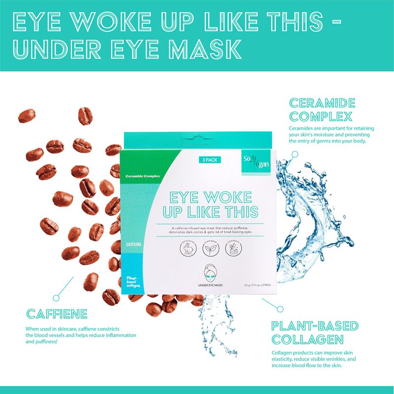 Enjoy SoloVegan's exclusive plant-based hydrogel under eye mask that delivers essences to the skin effectively by holding liquids up to 500x its weight! Featuring ceramide complex + caffeine + plant-based collagen, Our Eye Woke Up Like This collagen eye mask reduces puffiness, diminishes dark circles, and heals tired-looking eyes. This is the perfect eye mask for that sensorial & self-care treatment at home ✨ Why we love it: . 🍃 Plant-based 🐇 Cruelty-free 🚫 Clean beauty ⚡ Energizing 💧 Moisturizing ✔ For all skin types ✔ Ideal eye masks for dark circles and puffiness