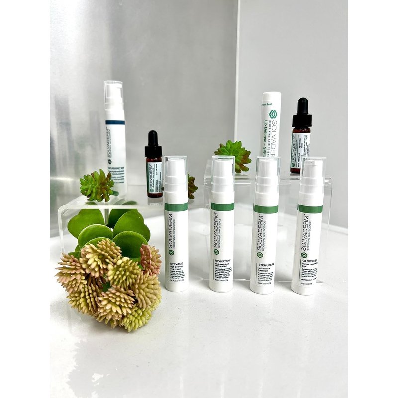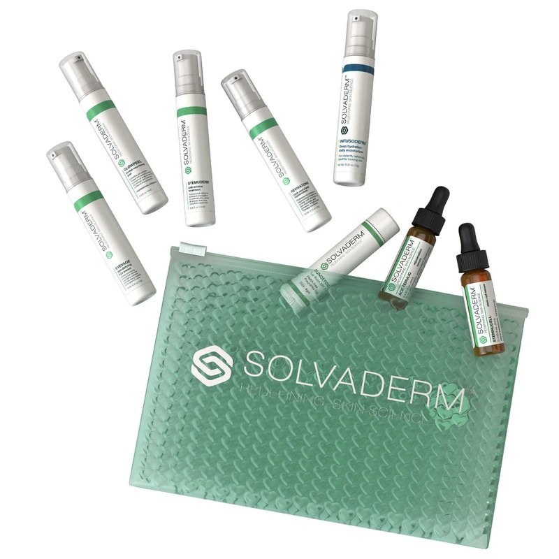 The Solvaderm Skin Essentials Starter Pack is a complete 8-piece collection of dermatologist-developed treatments for the face, neck, eyes, and chest, offering powerful anti-aging and skin-rejuvenating benefits. Ideal for all skin types, this travel-sized kit addresses wrinkles, fine lines, puffiness, discoloration, and skin damage while promoting a youthful glow.