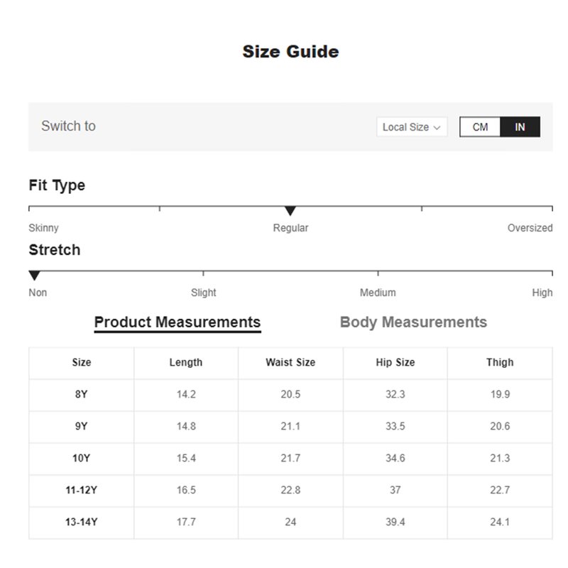 13-14Y: Length: 17.7", Waist Size: 24", Hip Size: 39.4", Thigh: 24.1"