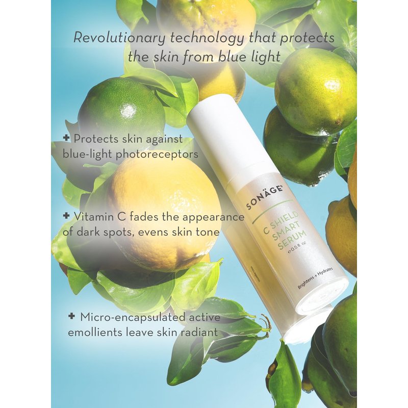 Introducing C Shield Smart Serum with a revolutionary technology that protects the skin from blue light from your smartphones and laptops. This lightweight water-based serum harnesses a unique liposomal delivery system to shield from digital pollution-induced environmental aging and help skin appear more radiant. The extra boost of citrus-derived Vitamin C fades the appearance of dark spots and helps skin look more even