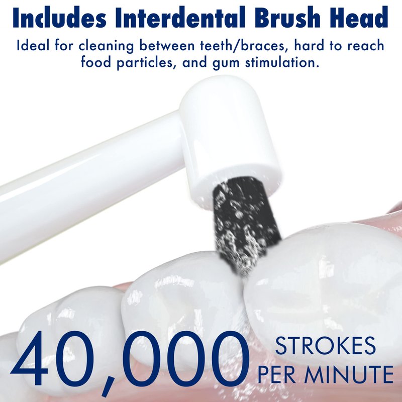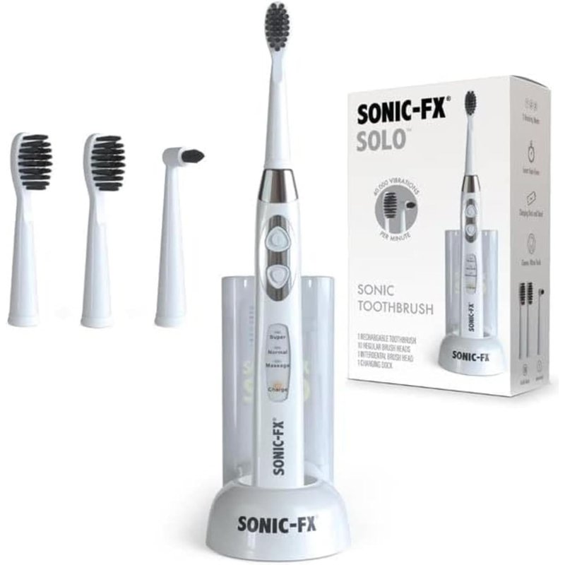 The Sonic-FX Solo electric toothbrush comes with charcoal-infused nylon bristles designed to clean teeth with an impressive 40,000 strokes per minute, more than other common electric toothbrushes and infinitely more than manual toothbrushes. This version of the Solo includes 10 standard brush heads plus 1 interdental head. This toothbrush has 3 brushing modes for a customized brushing experience: Super for deep cleaning, Normal for daily cleaning, and Massage for gum stimulation. The toothbrush is also programmed to spend the ADA-recommended 30 seconds on each quadrant of your mouth for a total of 2 minutes. The toothbrush will notify you every 30 seconds so that you go onto the next quadrant, and it stops automatically after 2 minutes. The proprietary brush head design has longer bristles along the perimeter and different height bristles in different areas to reach deeper in between teeth and clean teeth better. Twist & lock feature makes it quick and convenient to replace brush heads. The toothbrush is super lightweight, making it much more comfortable to use than others. This also makes it perfect for children. Being rechargeable means you can carry it anywhere, especially when traveling. Sonic toothbrushes are highly recommended by dentists to patients all over the world because of their performance in dental care and the comfort they provide. They are known to remove plaque much better than manual toothbrushes, and they also massage the gums more than regular toothbrushes. Details: Brand: Sonic-FXAge Range (Description): 3+Power Source: Corded Electric, Battery PoweredIncluded Components: 1 Solo Charging and Storage Dock, 1 Electric Toothbrush Handles, 10 Regular Brush Heads, 1 Interdental Head
