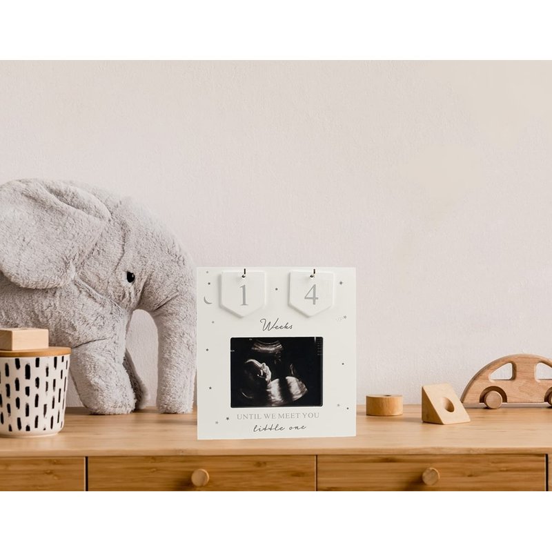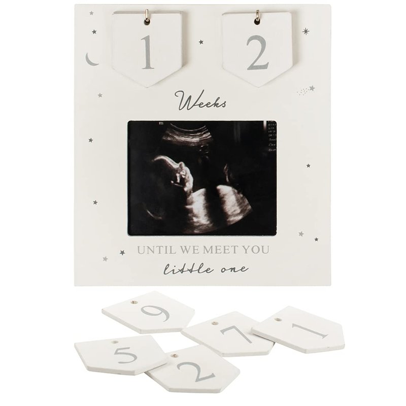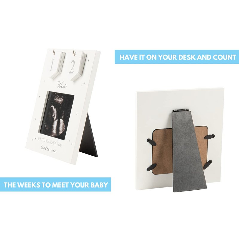 - ❤ INCREDIBLE QUALITY– Our 6” x 6.5” frame is made with a grey and silver styled wood, little stars and moon design, a quote that reads “Weeks until we meet you little one” and a set of numbers to place a count until the baby’s arrival with this countdown scan frame. Perfect for any nursery décor, parent’s room, grandpa’s living room and dad’s office. The frame comes with a 4”x3” photo opening, the right size for a sonogram or baby picture.