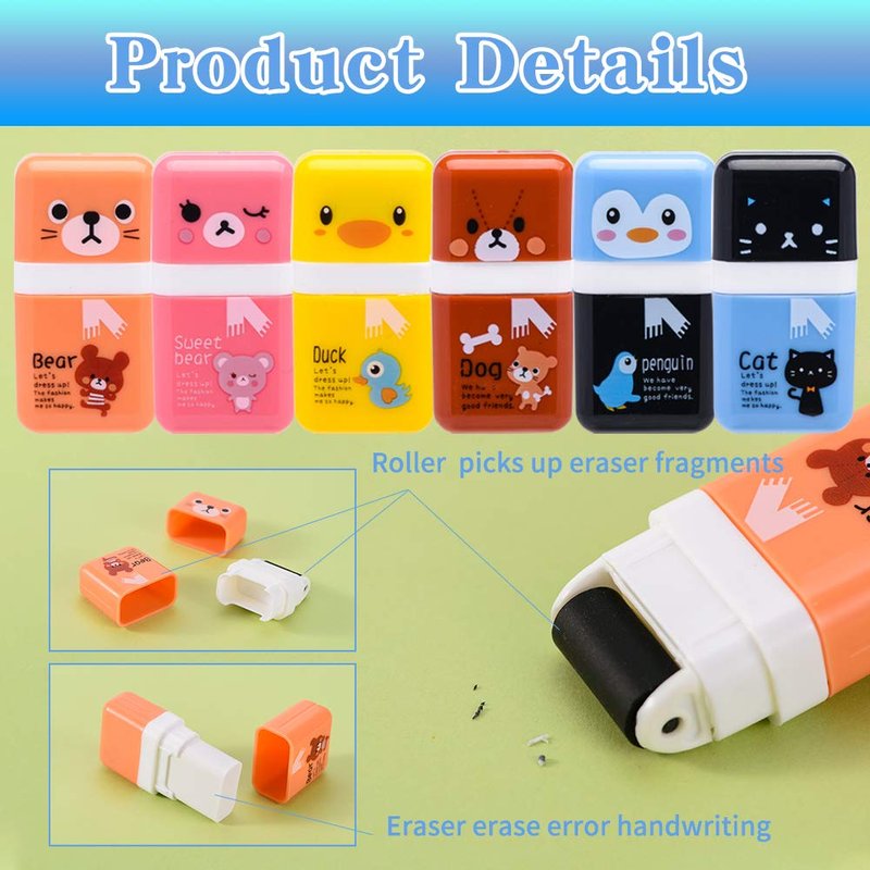 - Amazing function cute eraser: Sooez roller Pencil Erasers work well for its main purpose as an eraser. The opposite of eraser is roller which picks up the eraser "shavings" into its little garbage area, which is not only keeps your room tidy but also a great fun for the work. Nice and cute school supplies for kids.