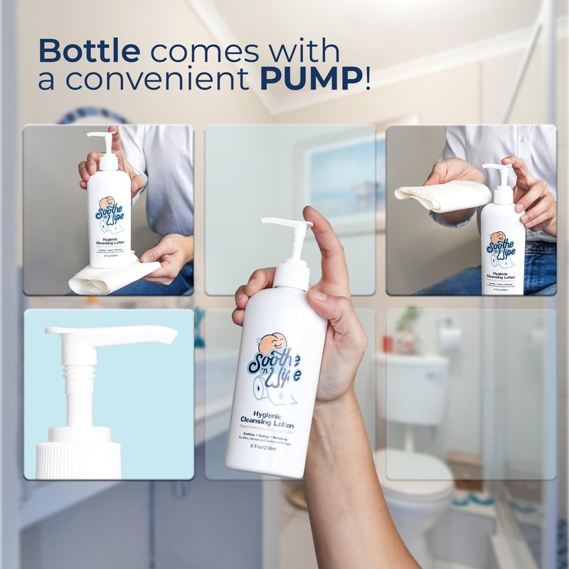 Welcome to Soothe 'n Wipe! We give you our easy-to-use hygienic cleansing lotion with pump. It has the ideal blend of soothing & refreshing ingredients like aloe, mineral oil & moisturizers to give you optimum anal cleanliness. This soothing skin lotion works like a wet toilet paper or toilet paper gel to make your bum clean & moisturized. Include this topical lotion to get fresh buns & see what you've been missing. We made this with unique & gentle formula to remove hidden residues that dry travel toilet paper packs alone leave behind. Use our pure & gentle toilet paper foam to remove organic matter without drying your skin. Our unique formula doesn't sting & only leaves you feeling refreshed. Start your hygienic bathroom experience with us. We'll help make diaper change manageable & you'll finally get rid of dirty undies because our cleanser lotion will help your kids get thorough bum cleaning! What's more, you'll get to use less paper with our septic-friendly flushable tissues. It won't clog or damage plumbing! Take this butt cleaner for men, women & children wherever you go. You can also put it in your bathrooms or office, so everybody gets the best treatment for their sensitive bums.