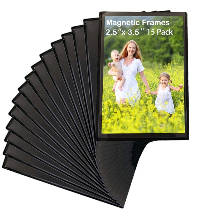 - Magnetic photo sleeve frame,Includes 15 pcs 2.5" x 3.5". With a black backing, it is perfect for exhibiting photos, pictures or prints.Widely use on a refrigerator, filing cabinet, steel door, magnetic whiteboard or other metal surface!