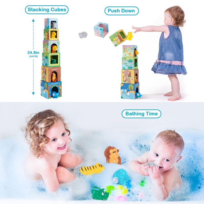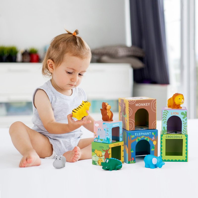 - Wild Animals Nesting & Stacking Blocks: Including 6 stacking cubes and 6 cute wild animal toys, they are made of great early learning material and ideal for babies’ early education and development, which can be used as Montessori materials. Nesting box are a great developmental gift for children ages 12-36 months.