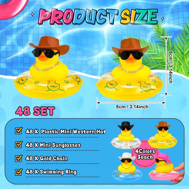- Funny Duck Decorations: you will receive 24 pieces of funny rubber ducks, each measuring about 2.17 x 1.77 inches/ 5.5 x 4.5 cm, equipped with a mini rose cowboy hat, swim circle, necklace and sunglasses; The ducks have interesting shapes and are suitable for decorating cars, offices, bedrooms and desks to add some fun and relieve your stress