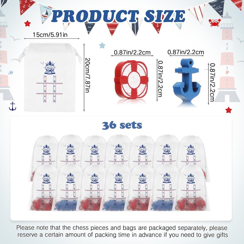 - Exquisite Design, Multifunctional Use: this 36 pieces cruise tic tac toe game gift set is highly acclaimed for its exquisite design; Each set includes 36 cruise themed non woven fabric bags that can be served as both the game board and convenient storage for the game pieces; Additionally, the set contains 360 pieces of anchor and lifebuoy patterned game pieces that need to be assembled by the recipient, please allow ample time for assembly to avoid missing gifting opportunities