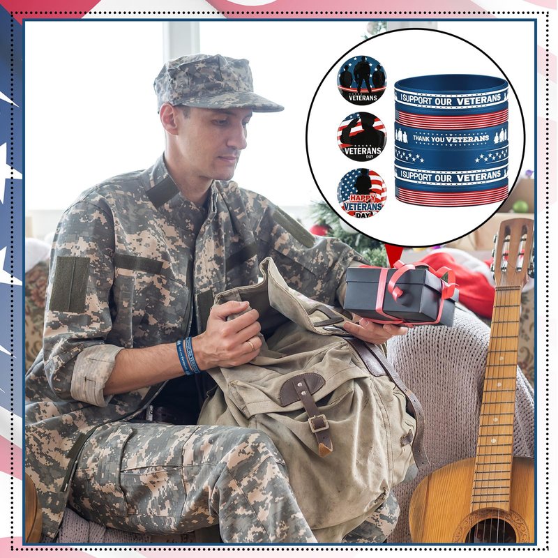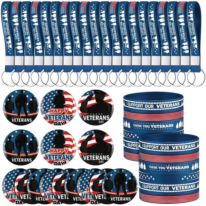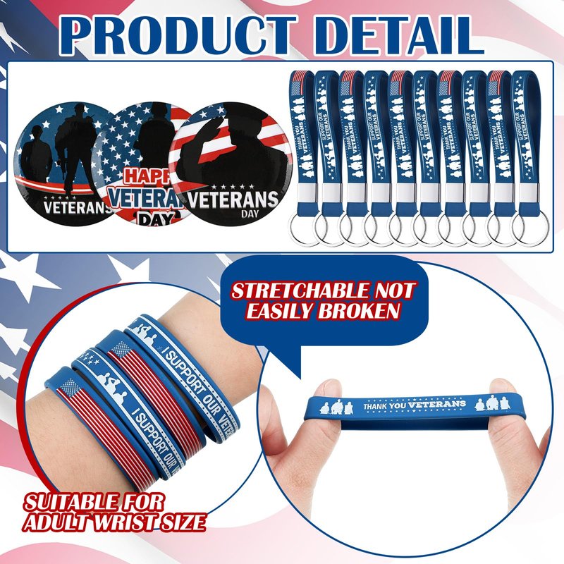 - Veterans Day Party Favors Set: there are 24 Veterans Day silicone wristbands, 24 Veterans Day keychains, 24 Veterans Day button pins; Sufficient quantity and style combinations can easily meet your various decorating needs and sharing needs for Veterans' Day