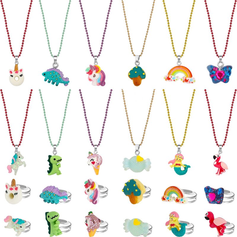 - What you get: 12 sets of matching jewelry with different shiny colors and styles, each set includes 1 necklace and 1 ring, different styles can match your different outfit, makes little girls look more beautiful