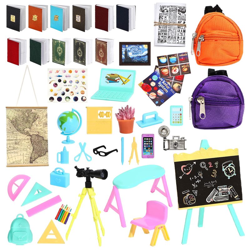 - What You Get:Package includes a pair of glasses,4 rulers,1 compass,1 computer,1 abacus,1 counter,1 schoolbag,1 blackboard,1 desk,1 chair,1 writing pen,6 color pens,1 globe,1 scissors,1 cup,1 hand pressure plate,1 camera,1 camera belt,1 potted plant,3 books,8 notebooks,1 potted plant,1 mobile phone,1 newspaper,1 map,1 star sky painting,1 telescope,3 planet introduction cards,1 planet sticker,2 backpacks