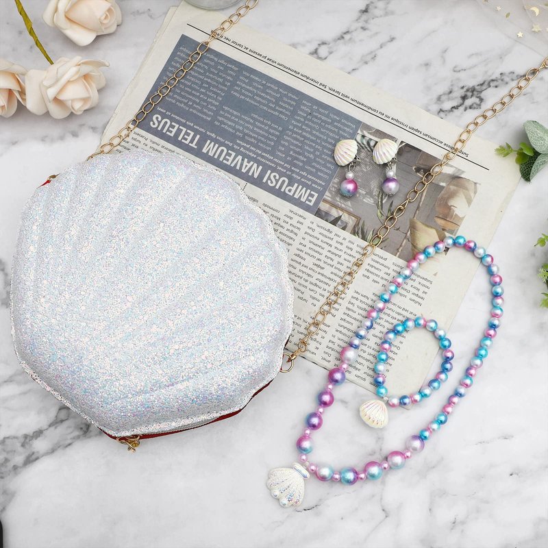 SOTOGO 6 Pieces Little Girls Purse Jewelry Set Toddler Shell Purse Cute Princess Handbags Shoulder Messenger Bag for Kids CrossBody Bag Dress Up Girls Jewelry Pretend Play
