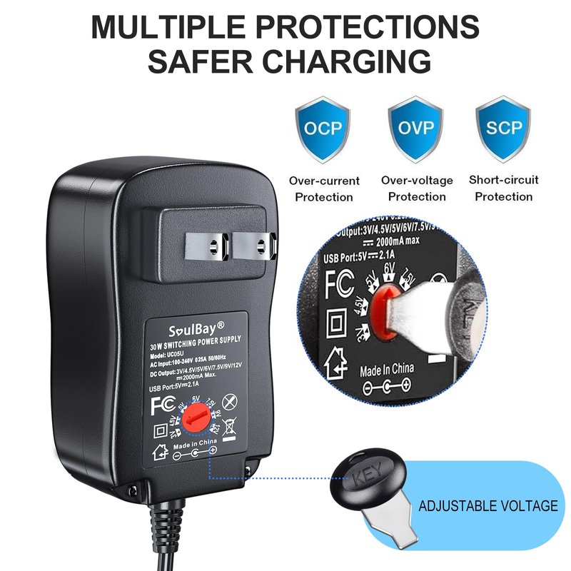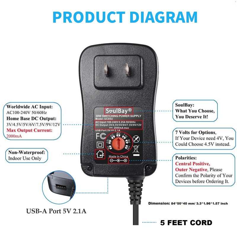 - SAFE AC/DC ADAPTER: Input: AC100-240V 50/60Hz, Output: DC 3V/ 4.5V/ 5V/ 6V/ 7.5V/ 9V/ 12V 0-2A, USB Port: 5V 1.2A, Cord: 5 FT; Smart chip with built-in advanced safety technology, with comprehensive protection against overvoltage/overcurrent/short circuit/overtemperature