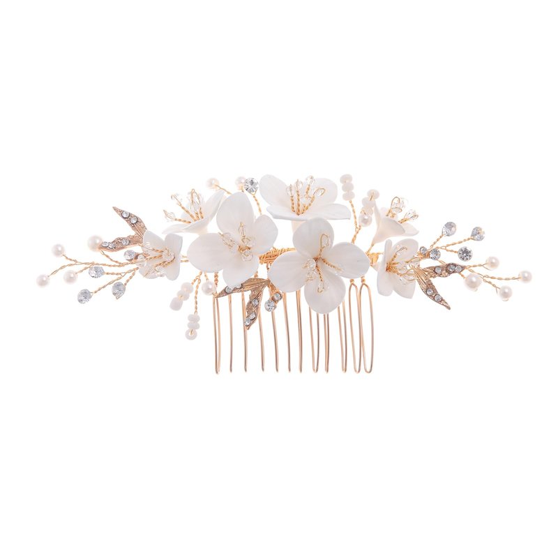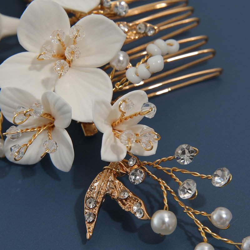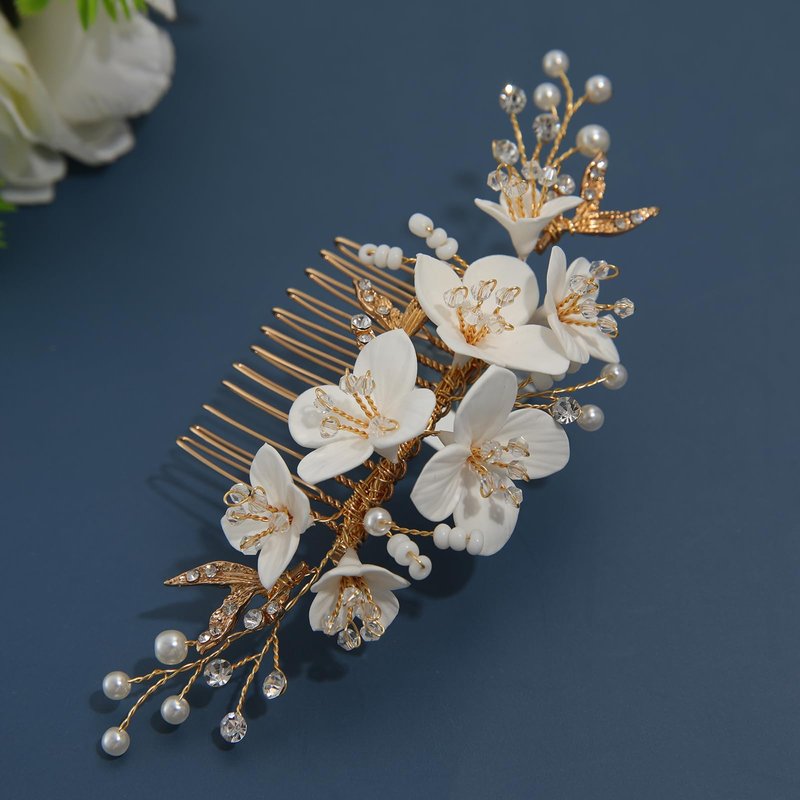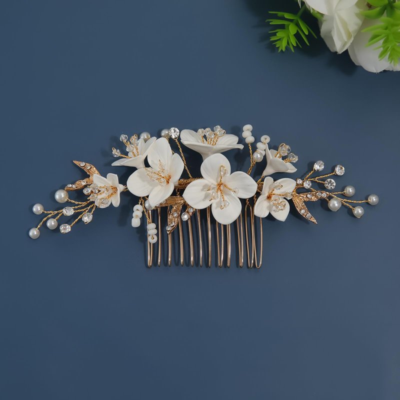 Soulshow New Soft Material Polymer Clay White Flower Wedding Hair Accessories Handmade Pearl Gold Wedding Hair Comb Bridal Hair Accessories