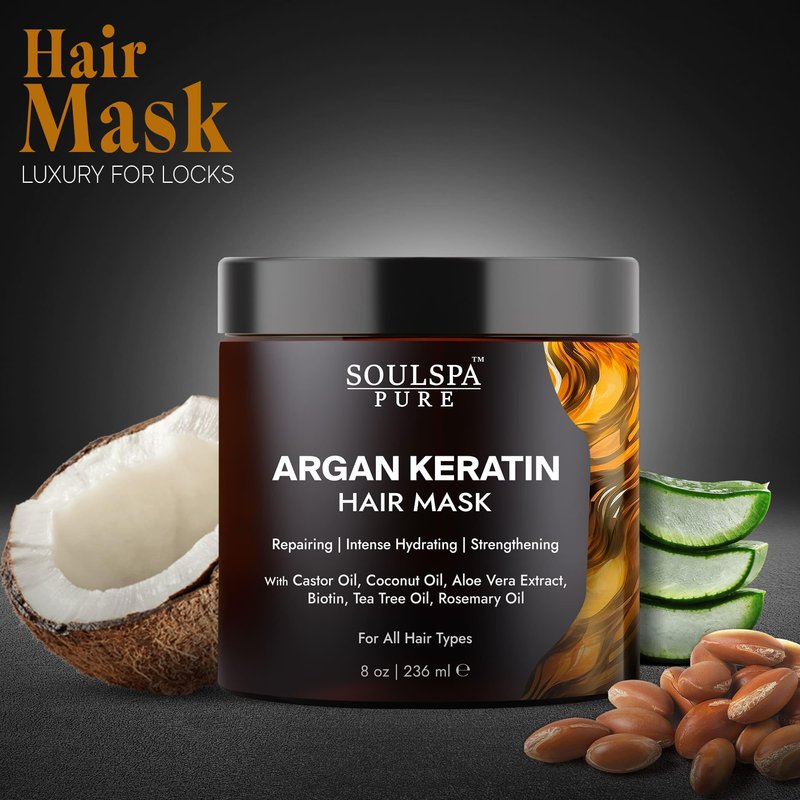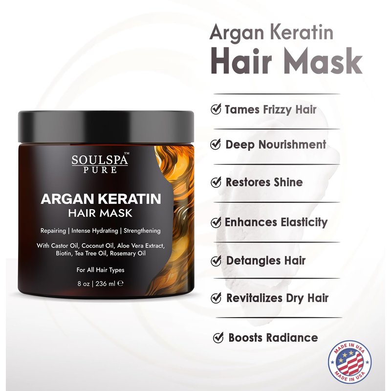 SOULSPA PURE Argan Oil Hair Mask with Keratin - Strengthen, Hydrate, and Repair Dry, Damaged Hair - Enriched with Biotin, Tea Tree Oil & Rosemary Oil - All Hair Types - for Men and Women- 8.45 fl oz