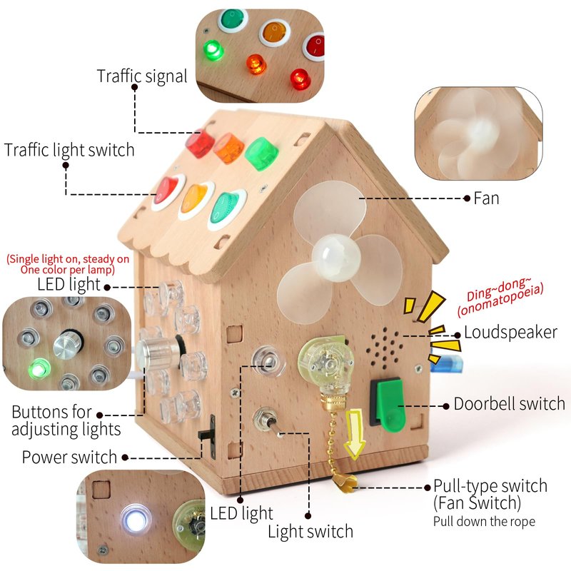 - OUR DIFFERENCE:Unlike other circuit board production methods on the market, our sensory boards are cut from whole logs, rather than glued veneer. We use the structure of a small house to bring together different functions, compared to a single piece of busy board, we are more interesting and cost-effective.