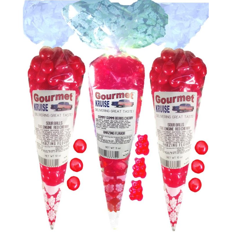 Sour Balls (2) Fire Engine Red Cherry (1) Red Wild Cherry Gummi Gummy Bears (NET WT 31 OZ) Gourmet Kruise Signature Gift Bags