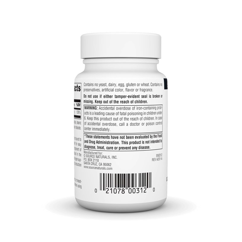 Source Naturals IRON chelate is composed of iron bound to amino acids from hydrolyzed vegetable protein for easy assimilation and utilization. Iron is a critical component of hemoglobin, the main oxygen-carrying compound in the blood, and therefore a prerequisite for adequate oxygen supply to the cells. Iron is also required for energy production and collagen synthesis.*