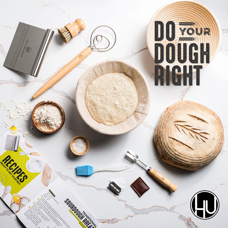 - SOURDOUGH STARTER KIT - Sour dough starter kit with 1x banneton bread proofing basket, 1x dough scraper, 1x dough whisk, 1x bread lame, 1x linen cloth with drawstring, 1x silicone basting brush, 1x bristle brush, and an instruction manual bookle