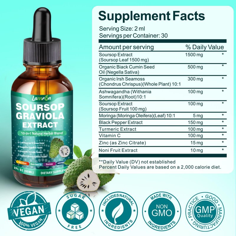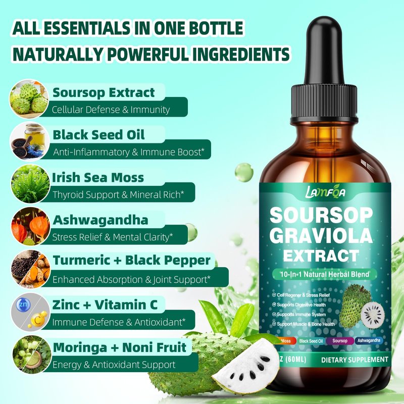 Soursop Bitters Liquid 10-in-1 with Ashwagandha, Black Seed Oil & Turmeric for Immune Support, Gut Health, Cell Regeneration & Antioxidant, Vegan, Non-GMO, Sugar-Free, 2 Fl Oz