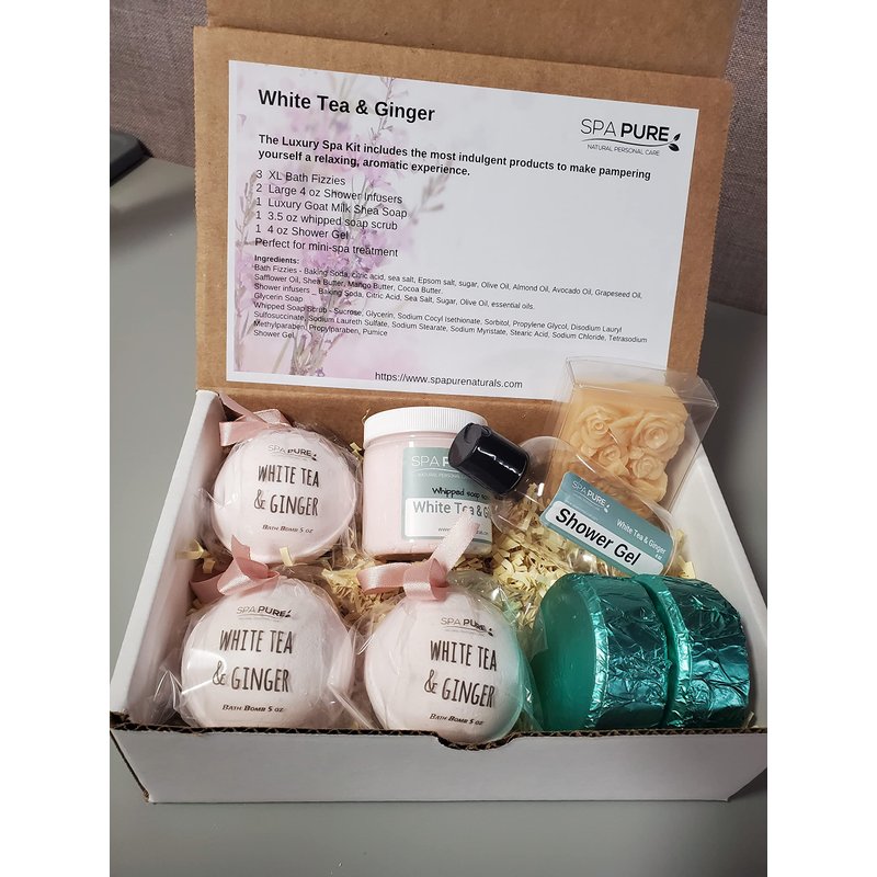 Spa Pure Luxury Spa Kit - 3 XL Bath Fizzies, 2 XL Shower Steamers, 3.5 oz Whipped Soap Scrub, Goat Milk Soap, Shower Gel (White Tea & Ginger)