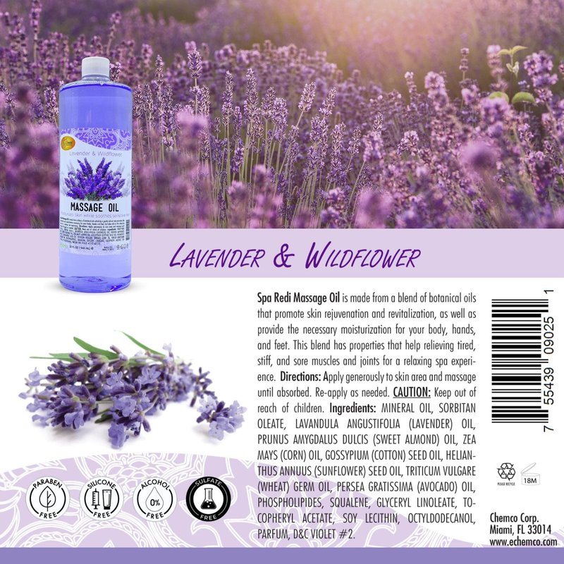 SPA REDI - Massage Oil, Lavender, 32 Oz - Professional Full Body Massage Therapy, Manicure, Pedicure - Relax Sore Muscles and Repair Dry Skin, Enhanced with High Absorption Oils and Vitamin E