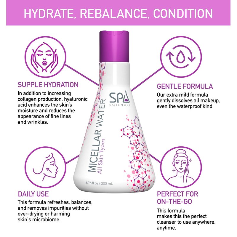 SPA SCIENCES - Micellar Water - Made in the USA - With Hyaluronic Acid & Chamomile, Cucumber, Seaweed Extracts - Soothe, Cleanse, Protect - Vegan - For All Skin Types - 6.76oz