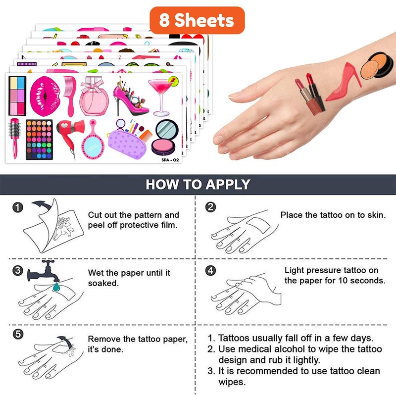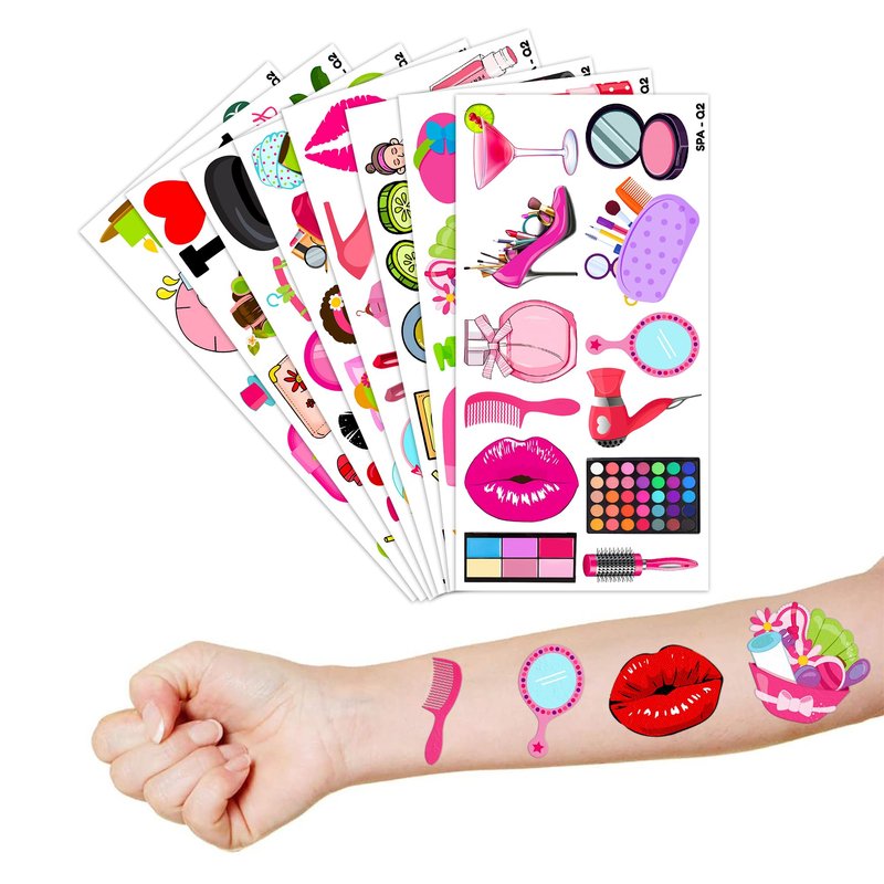 - Cute Spa Party Supplies: 8 sheets Spa themed temporary tattoos stickers, features an assortment of cute themed characters, each pattern measures 6.1 x 3.1 inch , all kinds of designs and colors will bring more fun to your party, one size fit all adult and kids.