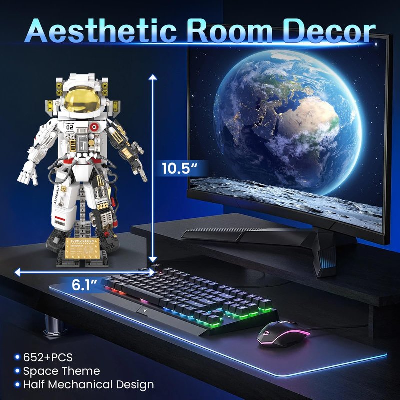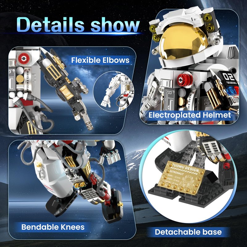 - Aesthetic Room Decor: The space decor building sets showcase intricate details, such as a chrome-plated helmet, hose connections, and a spotlight. With a removable base and over 20 movable joints, it allows for a variety of poses, making it ideal for both role play and display. Whether placed in a bedroom, living room, or office, it adds a captivating touch of space exploration to any space