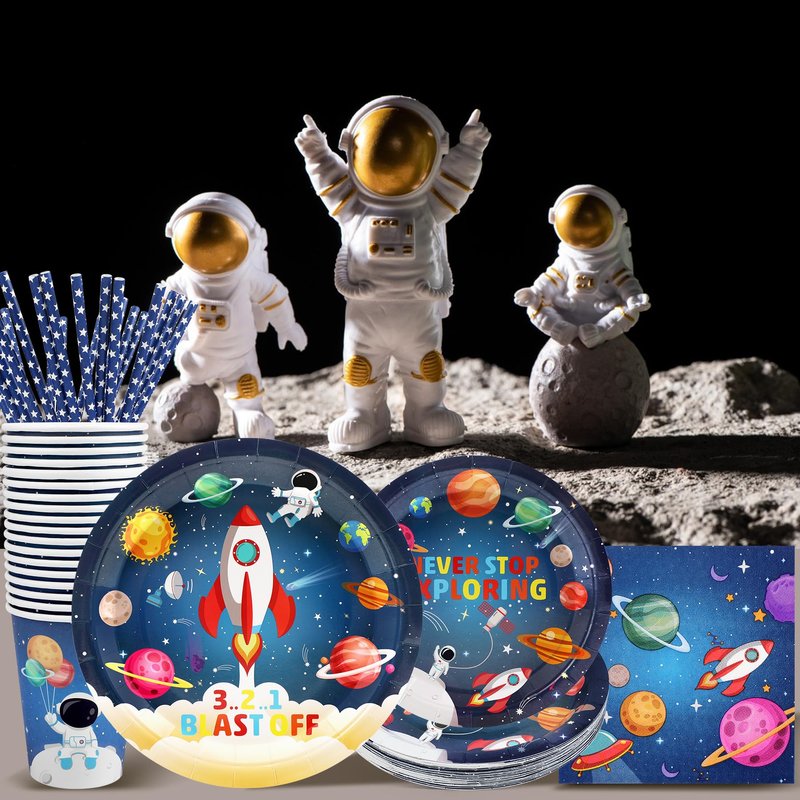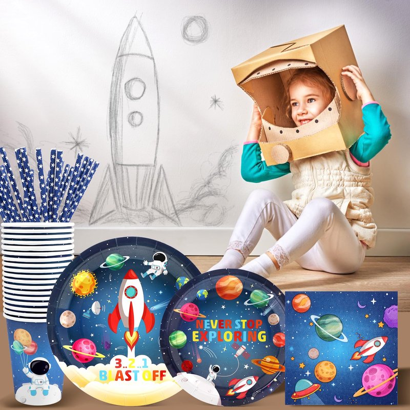 - 【Serves 24 Guests】: The space theme disposable dinnerware comes with 9" dinner paper plates *24, 7" paper dessert plates *24, 9oz paper cups *24, 6.5" napkins (3 layers) *24 and paper straws *24. The durable dinnerware set allows you to serve 24 guests at one time.