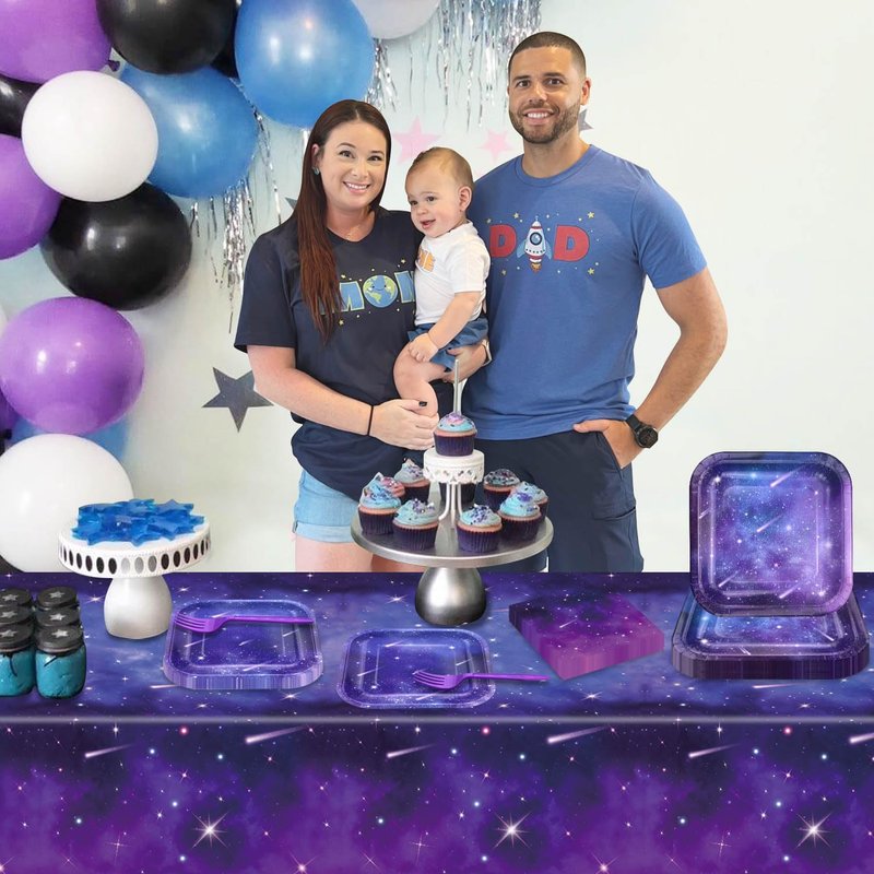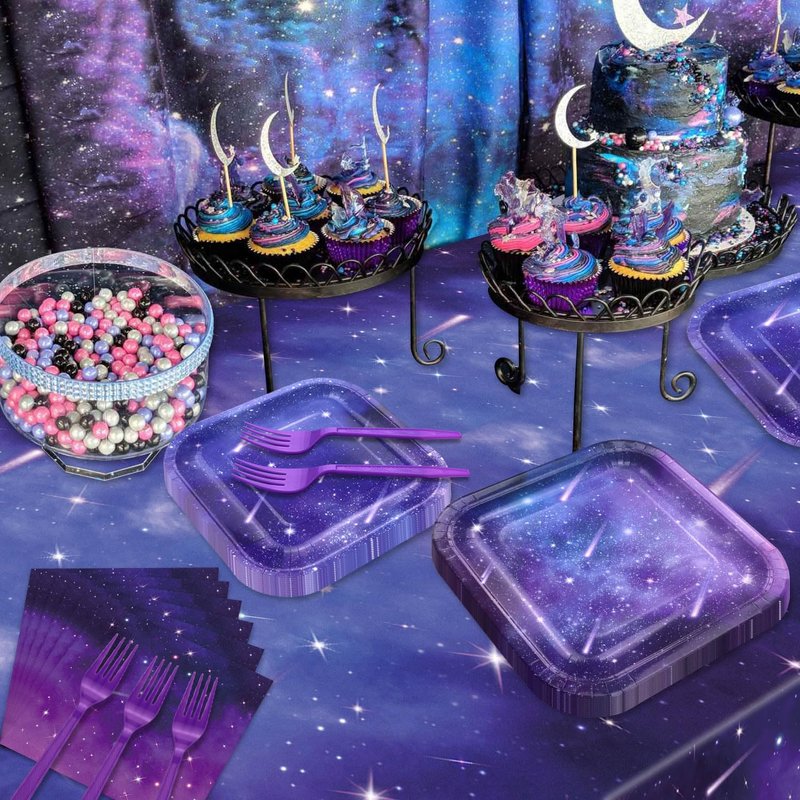 - 【Premium-Quality Galaxy Party Decorations】These purple galaxy tableware is made of thick paper and printed with vibrant colors. The space tablecloth is made of high-quality plastic, lightweight, waterproof, and not easy to tear and fade.