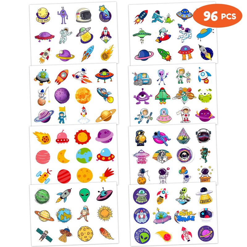 Space Temporary Tattoos Birthday Themed Party Supplies Decorations Favors 8 Sheets 96PCS Decor Cute Stickers Tattoos for Class School Prizes Gift for Kids Boys Girls Carnival Christmas Rewards
