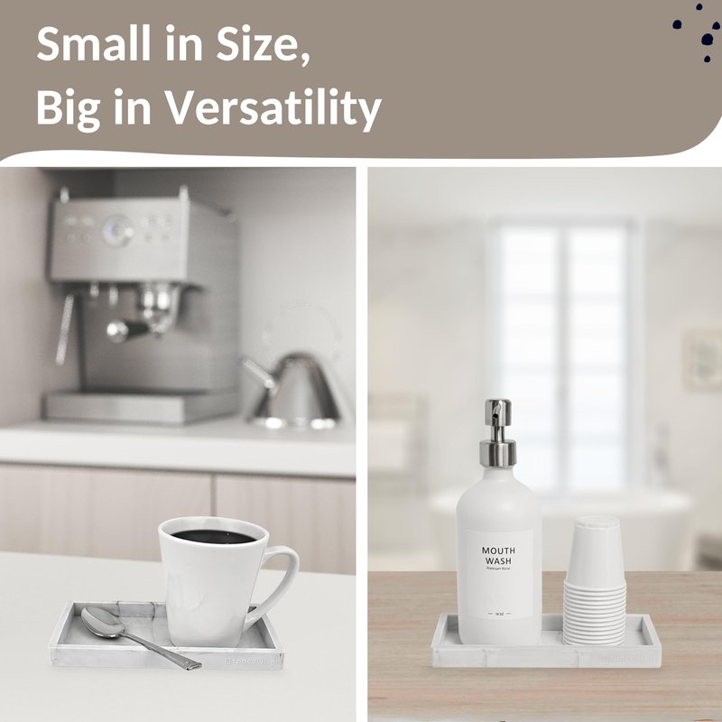 - The Details - Small Marble Tray - 7.7” x 4”. Made of flexible but sturdy food grade silicone. This marble countertop tray is the perfect marble kitchen sink tray for soap bottles, vanity tray, bathroom sink organizer or kitchen sink organizer. It’s the perfect sponge holder for kitchen sink areas and marble kitchen tray.