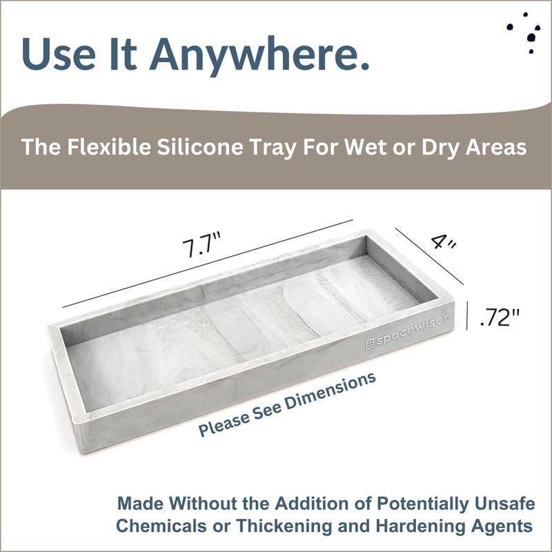 - Use It Anywhere – Choose the endlessly useful and aesthetically pleasing tray that works anywhere. The Spacewiser Original Silicone Tray is perfect as a bathroom tray, vanity tray or soap dispenser tray. Spacewiser trays are made of premium food grade silicone, without the addition of potentially unsafe thickening and hardening agents or chemicals. They’re shatterproof, waterproof, slip-resistant, heat resistant to 425F, and dishwasher safe.