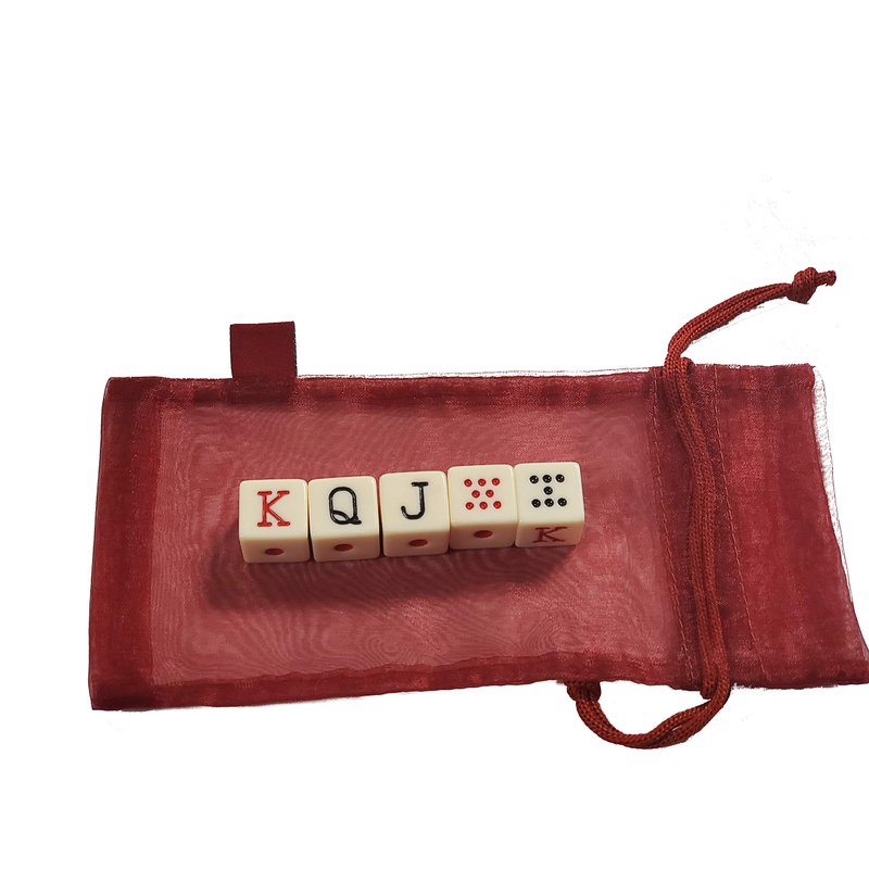Poker Dice is a dice game using five (5) special dice that have playing card values from a nine to ace, instead of the 1 through 6 pips on standard dice. Poker Dice can be played by any number of players and the rules for the game are very simple. Each player in turn gets up to three rolls of the dice to make the best standard poker hand, players put aside dice on each throw to build the 'hand' and the player with the best poker hand wins (suit has no relevance). A variant of poker dice, liar dice allows bluffing. Each player shields his throws and announces his hand, either truthfully or not. The second either attempts a better hand or calls the bluff. If the caller is correct in his call, he wins; if not, he loses. Hand Values Object: To get the highest hand, this is the greatest number of the highest valued card. The highest possible hand is 10 Kings. Value: Ace/Wild = 1 dot King = K Queen = Q Jack = J 8 = 8 Dots 7 = 7 dots Playing: Each player rolls one die. High roll goes first and play moves to the left. A player rolls all five dice and puts aside the dice the player wishes to save. The player then re-rolls the remaining dice if any. If the player has five of a kind at the end of the first or second roll, then the player may re-roll all five dice once and add any matching dice to the previous total On the players first roll of the dice the ace is wild and can be used to match any die. On the second or third roll of the dice an ace only counts as wild if another die matching the first roll is rolled On the extra roll of the dice, after a 5 of a kind, the ace only counts as wild if another die matching the first roll is rolled