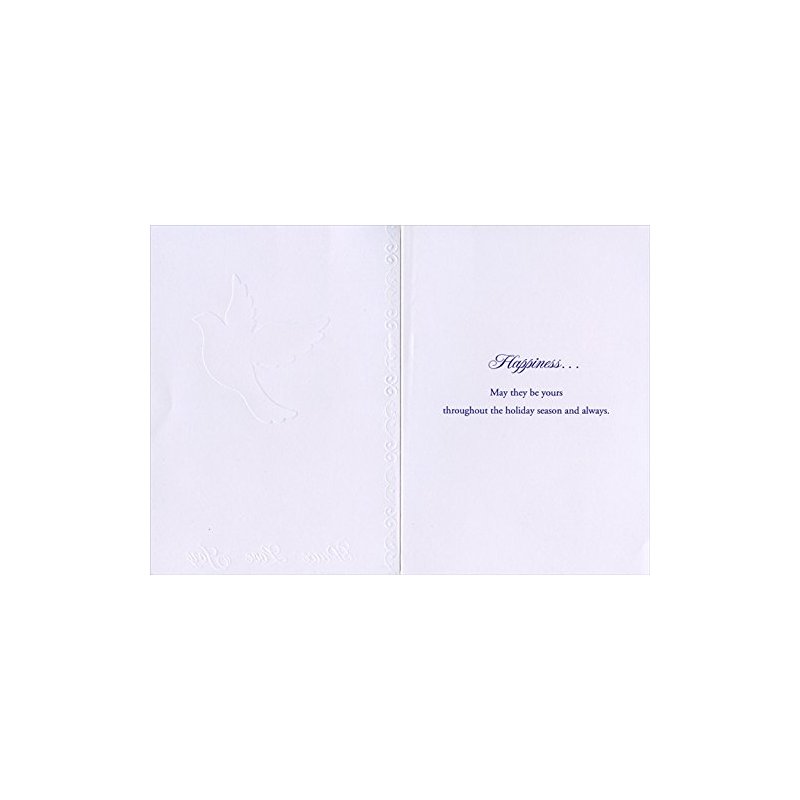 The interior of this Designer Greetings Christmas card design reads: Happiness… May they be yours throughout the holiday season and always. Each card measures 5.5x7.875 inches and is printed on heavy cardstock. The set includes 30 cards and 30 envelopes. The cards have the following special features: glitter, embossed, spot uv coating. Spot UV coating creates a wondeful shimmering look to the dove and beams that radiate outward on the artwork featured on this beautiful Christmas card design. Accents of glitter sparkle in the swirling patterns along the left edge of the card.