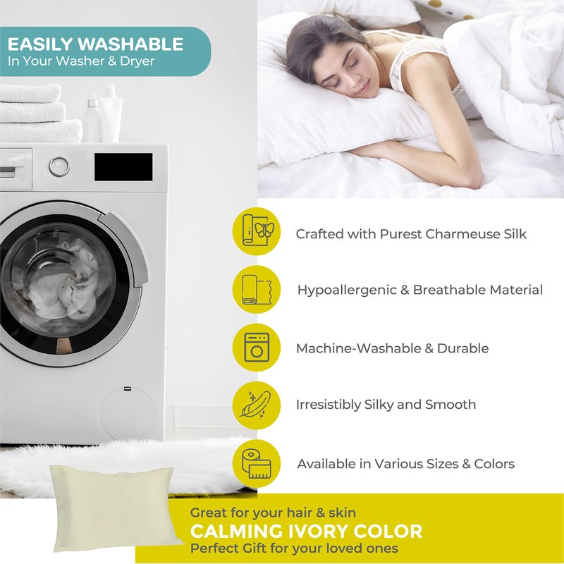 - Envelope Style Pillowcase: With an envelope flap closure, this silk pillowcase for hair and skin will stay in place all night long. Machine wash this ivory pillowcase on the delicate setting and air dry.