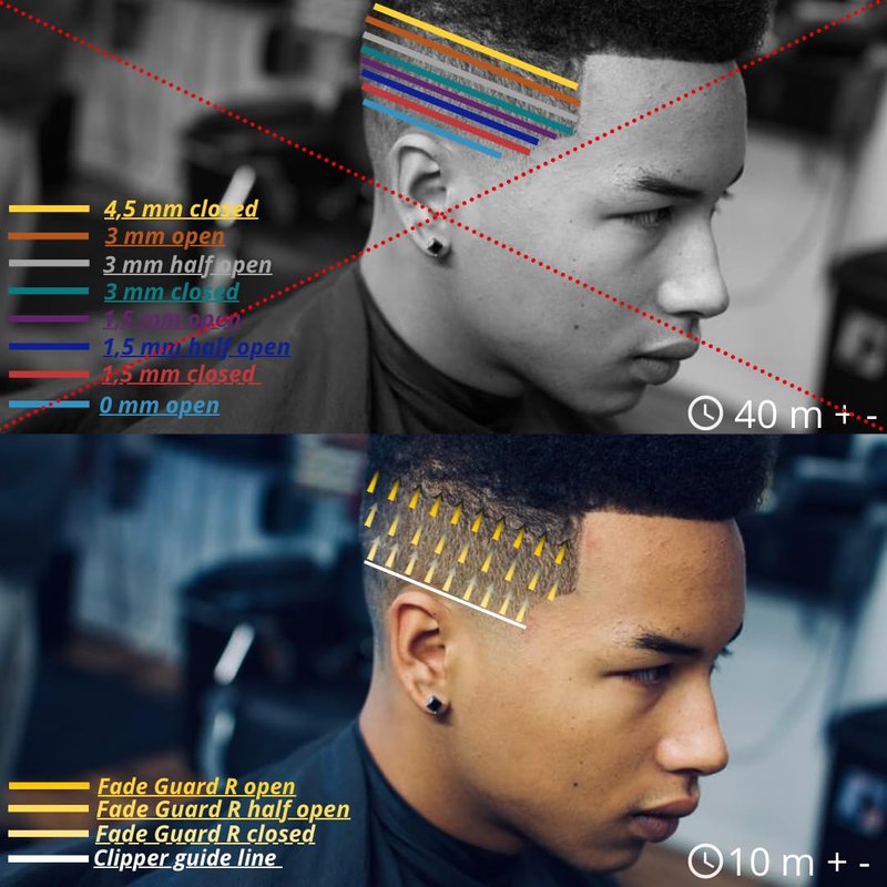Fade Guards 3-in-1 special hair clipper guards for a fade haircut. Perfect for beginner barbers and amateurs at home for a self-haircut. Suitable for almost all Wahl hair clippers! Perfect for barbers and amateurs at home for a self fade haircut at home. Suitable for almost all Wahl hair clippers! After you made a guide line you click the Fade Guards on your clipper. You cut against the hair focusing on the sharpest corner! Do not shave totally side lines but on 45 degrees as mentioned in image 6! Step 1: Begin with the Fade Guard Right or Left on open and blend from low to higher from on the guide line. Step 2: Put the hair clipper on half open and blend out more from low to a bit higher. Step 3: Put the hair clipper on closed and blend out the last line. Forget the many different standard hair clipper guards where you must go through 7/8 steps. From now on you can fade in 1 shave with these Fade Guards! For who? For anyone with short hair who wants an elegant fade haircut. Save money, time and nowadays your health to cut your hair yourself at home. It is also perfect for barbers to work faster and focus on more clients. Fade Guards are made of special materials that is easy attachable, has more grip on the hair but also glides through hair quickly and efficiently. This makes you less likely to slip out when shaving. Our product is designed in such a way that you no longer must switch between different guards. Fade Guards increases from your clipper on closed to 4.5 millimeters. This applies both horizontally and vertically to create automatically a fade. Try our special Fade Guards now and be your own barber or better barber today! Don't have clippers yet? Then order one with the right blade and with an adjustable handle. You also need a small hand mirror to get a good view of the back of the head. Make sure you have enough good lighting and you are ready to go!
