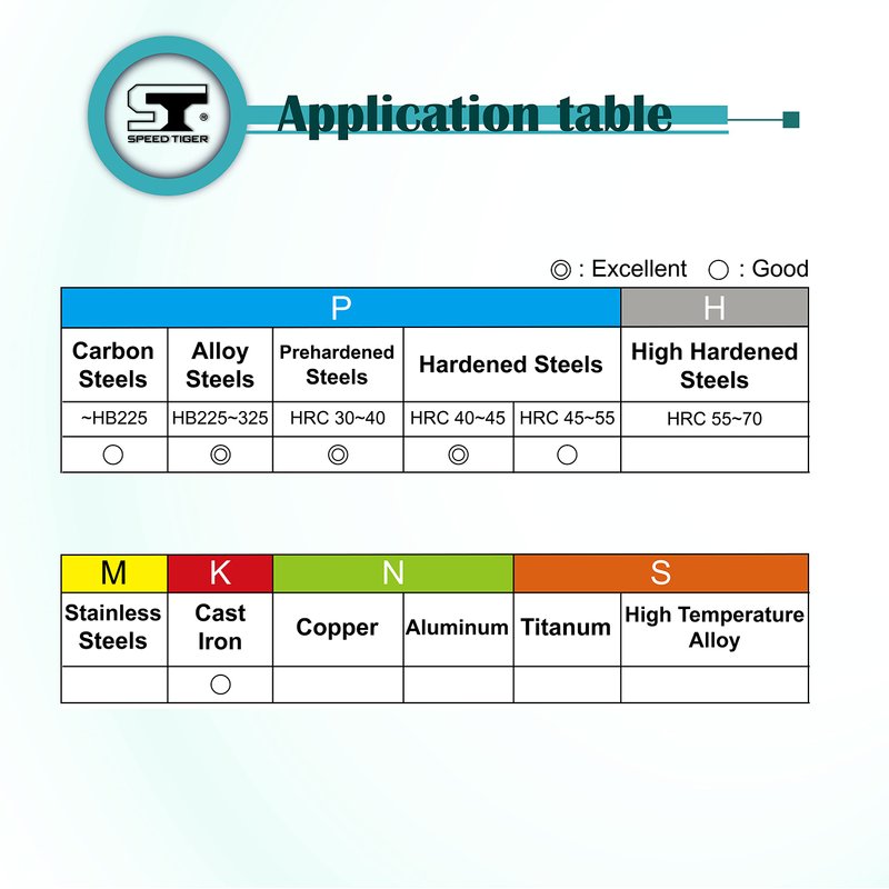 - ✅ APPLICATION - Our carbide tools are highly effective at machining various types of steel such as Carbon Steels (~HB225), Alloy Steels (HB225~325), Pre-hardened Steels (up to HRC45), Hardened Steels (HRC40~51), and Cast Iron.