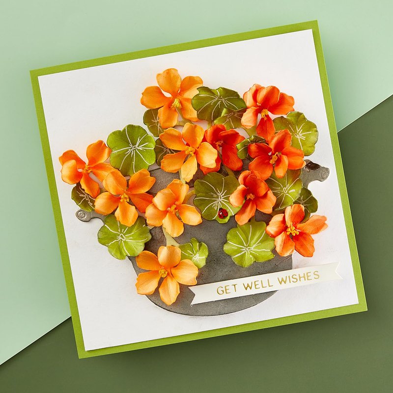 - This set of four thin metal cutting dies includes a wash bucket as well as bright and colorful Nasturtium five-petal blooms to fill it. A fun set for flower loving papercrafters!