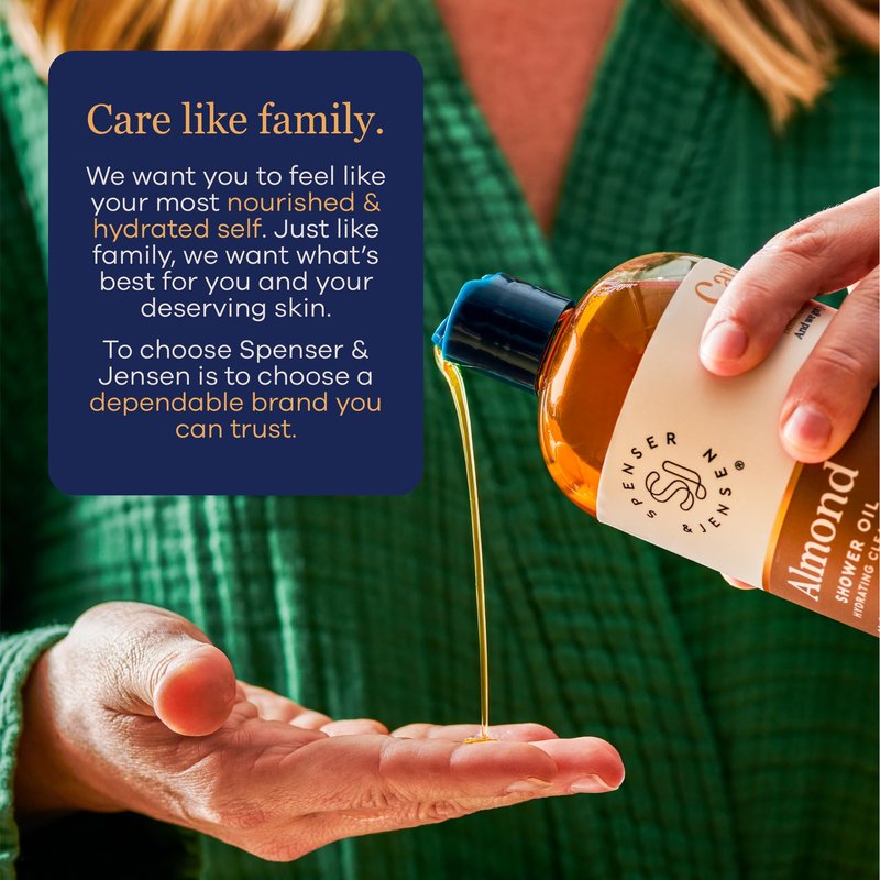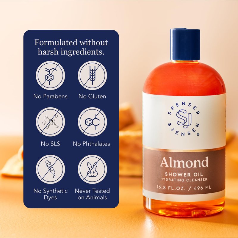 Revel in satiny soft skin! Our shower oil is infused with an aromatic almond oil to bring a luxurious feel to every bath time. Rich in Vitamin E, almond oil easily absorbs into the skin, balances moisture and water loss, and won’t clog your pores. Gentle on sensitive, oily, dry, and combination skin types, incorporate this milky cleanser into your shower routine to achieve supple and healthy skin that glows with radiance. Pour or pump a quarter-size drop of shower oil into your palms and use both hands to work it into a velvety, sheer lather. Rinse and enjoy irresistibly soft and moisturized skin. Our almond oil is also free of harsh ingredients. From The Manufacturer: As a women-founded brand, Spenser & Jensen is committed to providing you and your household with clean products you can trust. That’s why our products are sulfate and paraben free, and you won’t find any harsh ingredients…ever. We pride ourselves on designing a bath and skincare collection for all skin types and for everyone.