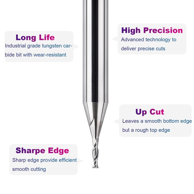 - SPECIFICATION. Solid carbide up cut router bits with 1/4inch shank and 1/16inch cutting diameter, 1/4 inch cutting length,2 inch for total length, can be used on routers with 1/4" collect.