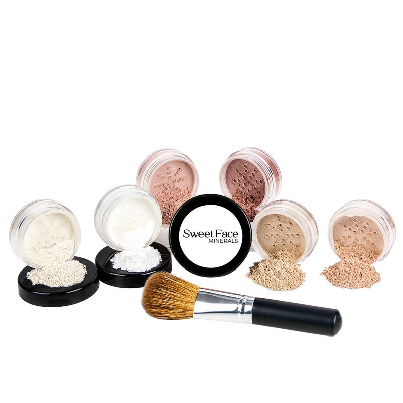 This Kit Includes: Mineral Foundation: Sweet Face Minerals foundations are all natural and very lightweight. Our products never appear heavy or look caked and are wonderful for every skin type. Will not cause irritated itching skin or acne. Mineral Concealer: Our concealers will offer more coverage than your regular foundation blend. Concealers are ideal for hiding dark under eye circles, and concealing blemishes, camouflaging imperfections and will help to neutralize the look of splotchy skin. Sweet Cheeks Blush: A soft and natural earth toned pink color. This shade is very mild and because it's mineral makeup, it has staying power!. Bronzer: Bronzer can be applied on top of your foundation. Use as an eyeshadow, on the face for a sun-kissed appearance or as a complete body shimmer. Our Bronzer has a natural SPF and comes in a beautiful copper tone leaving your skin looking radiant while illuminating a soft focus summertime glow. Miracle Veil: This veil is completely translucent and works with all skin types and tones. It can be worn under or over your makeup, providing the ultimate finishing touch. Our veil products absorb excess oil and moisture, infuse pure softness and dramatically reduce the appearance of pores, fine lines and wrinkles. Use for a balanced, flawless look and a long lasting appearance. Perfection Finishing Powder: This silky feather-soft powder provides weightless, breathable layering to your skin. Brush it on after your makeup has been applied. Its light and delicate and gives the appearance of perfection! Flawless Face Powder Brush: This brush is so handy and compliments this amazing kit. Includes an instruction card for applying your makeup like a pro. These are all 20 gram sifter jars filled to capacity with 9 grams of powder.