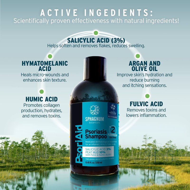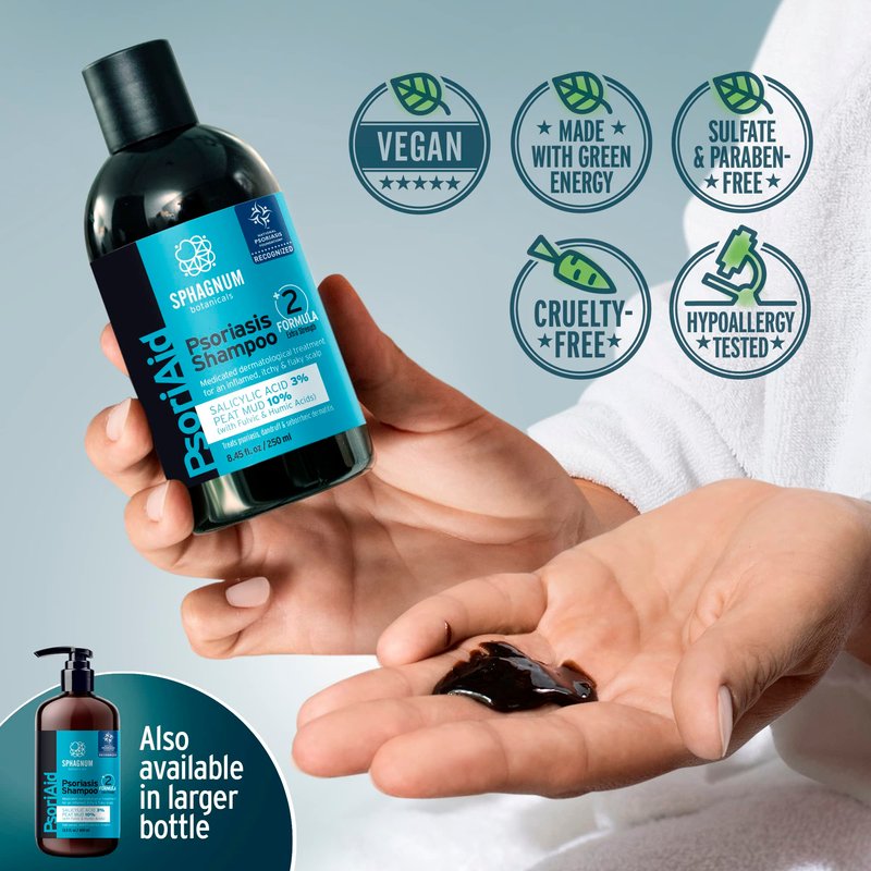 Sphagnum Botanicals Psoriaid Psoriasis shampoo with salicylic acid, humic and fulvic acid and menthol. Helps clear heavy dandruff, relieve the itch and redness caused by psoriasis or eczema. Does not contain coal tar. Introducing the Ultimate Psoriasis Shampoo and Conditioner Treatment Set - Your Path to a Healthier Scalp and Beautiful Strong Hair! Are you tired of struggling with the discomfort, itchiness and embarrassment caused by psoriasis on your scalp? Look no further than our Psoriasis Shampoo and Conditioner Set, meticulously crafted to provide you with soothing relief and effective care. Product Highlights: Targeted Psoriasis Treatment: Our shampoo and conditioner set is specially formulated to address the unique needs of individuals dealing with psoriasis on the scalp. With a potent blend of active ingredients, including the powerful psoriasis-fighting agent, salicylic acid, this set helps to gently exfoliate, reduce redness, and alleviate itching. Soothing Relief: Say goodbye to the constant discomfort and irritation that psoriasis can bring. The calming properties of our shampoo and conditioner work in harmony to provide a soothing sensation, helping to ease the discomfort associated with psoriasis. Healthy Scalp, Beautiful Hair: Beyond its therapeutic benefits, our set is designed to promote overall hair health. Nourishing minerals and vitamins enrich the formula, helping to revitalize your scalp while leaving your hair looking lustrous and full of life. Gentle Yet Effective: We understand the sensitivity of psoriasis-affected skin, which is why our formula is gentle enough for regular use, even on the most delicate scalps. The absence of harsh chemicals and sulfates makes it suitable for a wide range of individuals seeking relief.