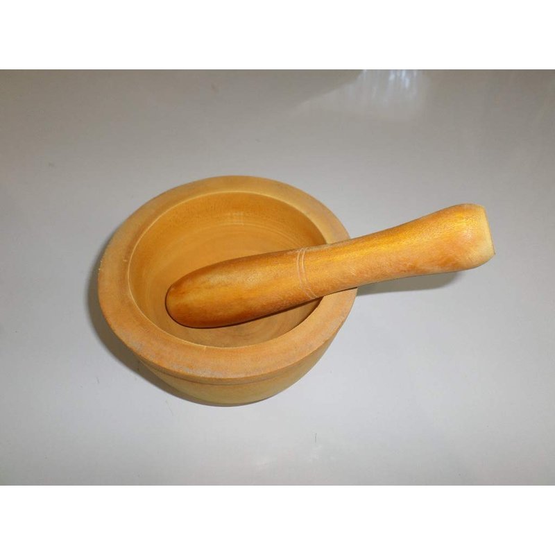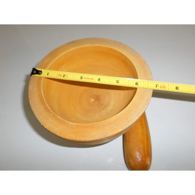 this spice smasher wooden mortar and pestle is hand made out of wood and the mortar might not be perfectly round and the one you get might be little rough, since the factory do not have the packaging for this item, the one you get might have some handling dings or dents and scratch, this doesn't hurt anything on the use of this spice smasher. please refer to the pictures for more information. please wash thoroughly before use. the mortar bowl measure around 7 inch outside diameter and 5 inch inside diameter x around 2.5 inch inside depth and over high around 4.5 inch, the pestle measure around 8.5 inch long x around 1.5 inch large diameter and 1.25 in small end diameter with little concave for easy to hold when in use.