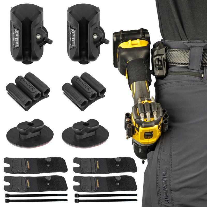 Spider Tool Holster - Quad Tool Kit - Adhesive Tool Tabs + BitGrippers + Self locking, quick draw Belt Holster Clip for carrying a power drill, driver, hammer, tape measure, pneumatic, light and more!