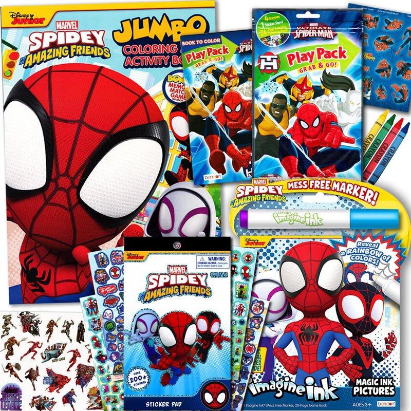 - Spidey and His Amazing Friends Coloring and Activity Book Super Set- Includes one Spidey Imagine Ink, one Coloring Book, one Spiderman Grab & Go Play Pack and Spidey and His Amazing Friends Sticker Pad with bonus 1 sheet of DC Justice league stickers.