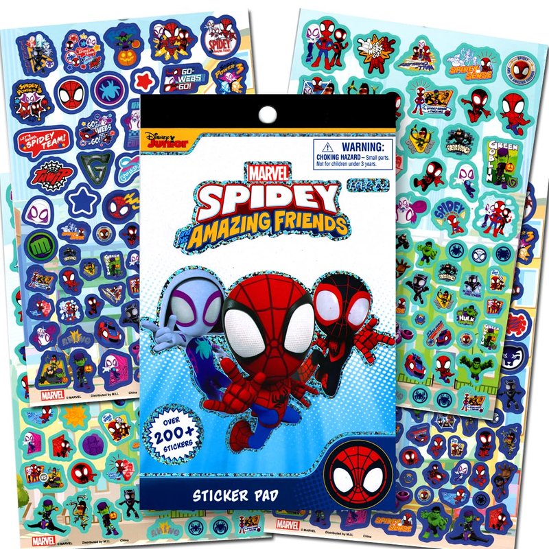 - Spidey and His Amazing Friends sticker Pad includes 4 sheets with over 200 stickers featuring favorite characters including Peter Parker, Miles Morales, and Gwen Stacy