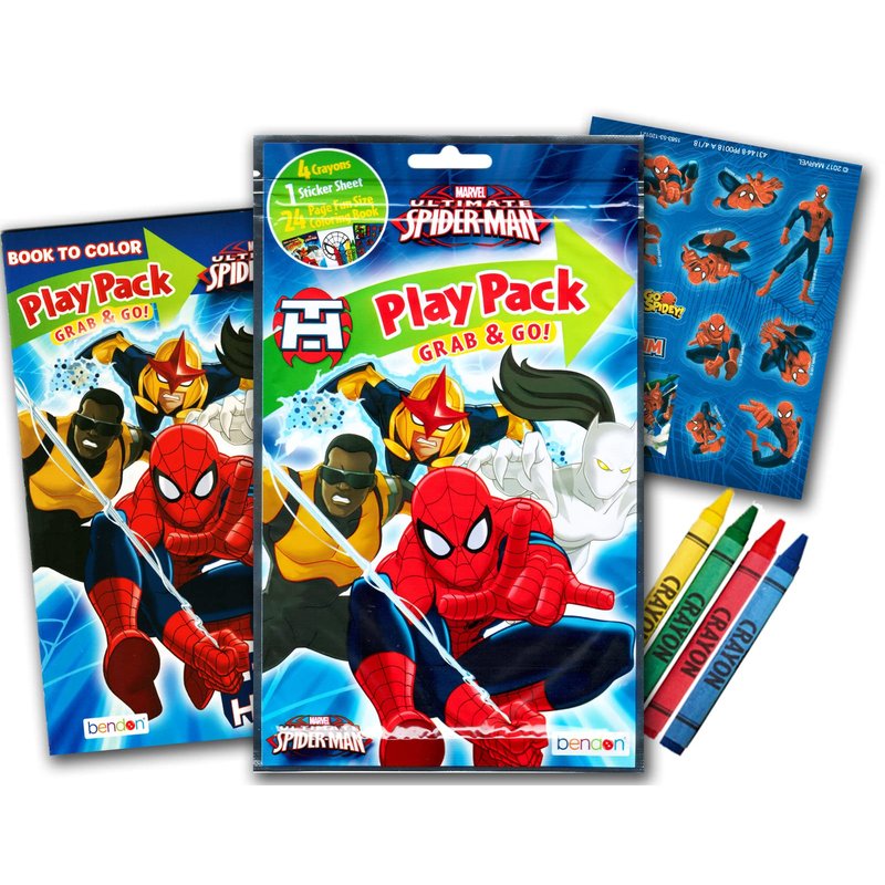 - Spiderman Superhero Grab and Go Activity Pack includes 1 sheet of Stickers, one 24-page mini fun size coloring book and 4 coloring utensils