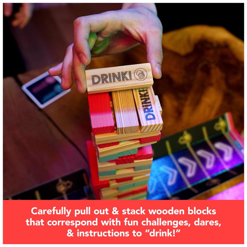 - TAKE ON THE TIPSY CHALLENGE: Carefully pull out and stack wooden blocks corresponding with hilarious challenge cards that go from easy to hard depending on the color Choose any beverage you like to play